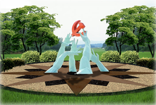 核心區(qū)以象征性雕塑彰顯五維共治主題。雕塑由五只手臂和一個(gè)黨徽組成,五只手臂象征 “五維共治理念” ;共同捧起的黨徽。喻指在黨的領(lǐng)導(dǎo)下和五維共治“理念引領(lǐng)下,實(shí)現(xiàn)山門村的美麗中國夢。