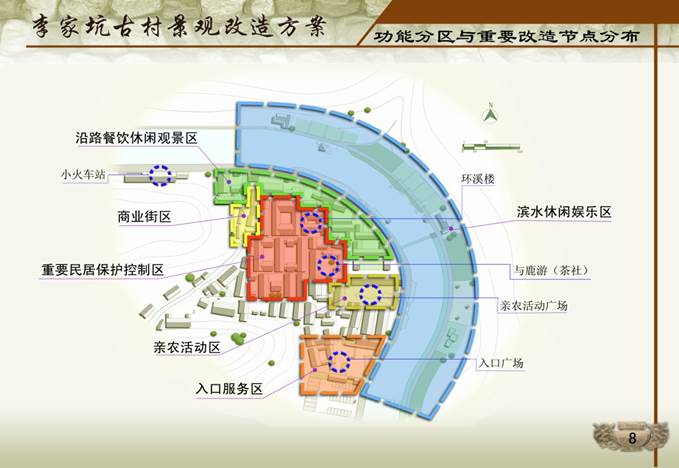 總體規(guī)劃基于原有文脈地脈,既注重古建筑保護(hù),同時導(dǎo)入現(xiàn)代旅游業(yè)態(tài).以章溪水自然地形為基礎(chǔ),規(guī)劃濱水與古村兩大板塊、六個主要功能區(qū)。