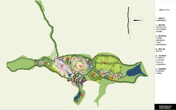 在常規(guī)的“城郊休閑目的地”功能基礎(chǔ)上,本案尤其強調(diào)“學(xué)旅互動、婚旅互動、農(nóng)旅互動”三大功能,并將其落實到六大空間板塊上。