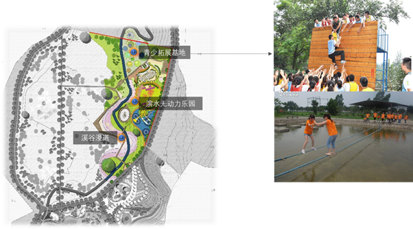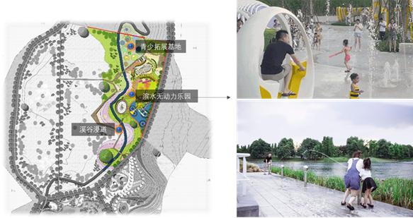 本區(qū)主要項目含溪谷漫道、濱水無動力樂園、青少素質(zhì)拓展基地等。功能上兼顧游親水景觀、親子娛樂、修學(xué)拓展。
