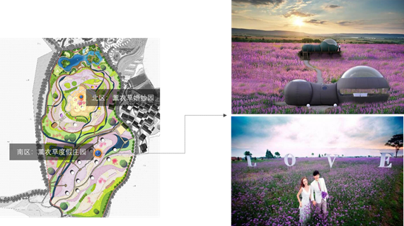 (2) 南區(qū)薰衣草度假莊園:偏度假功能。創(chuàng)意薰衣草“花海氣泡屋”為主要特色;同時也兼具北區(qū)的觀光攝影功能。