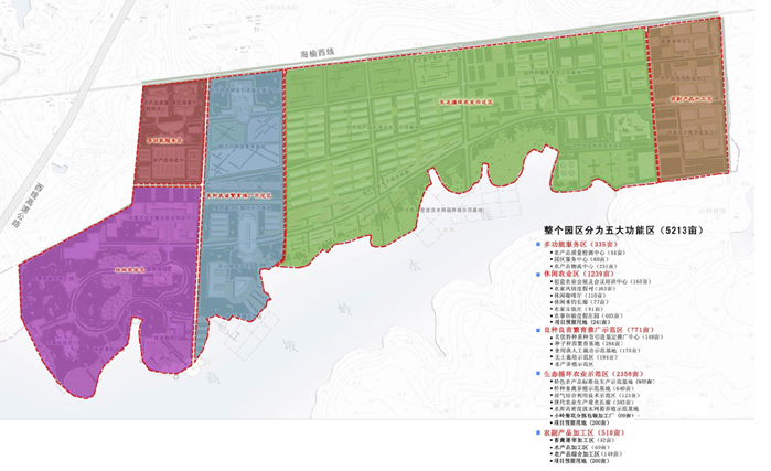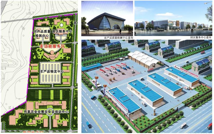 多功能服務區(qū);休閑農業(yè)展示區(qū);良種良苗繁育推廣示范區(qū);生態(tài)循環(huán)農業(yè)展示區(qū);農副產(chǎn)品加工區(qū)