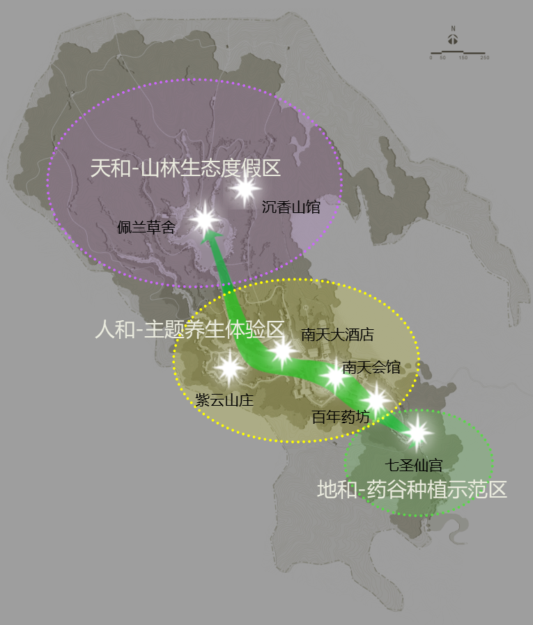 七圣仙宮、百年藥坊、南天大酒店、南天會(huì)館、紫云山莊、沉香山館、佩蘭草舍。