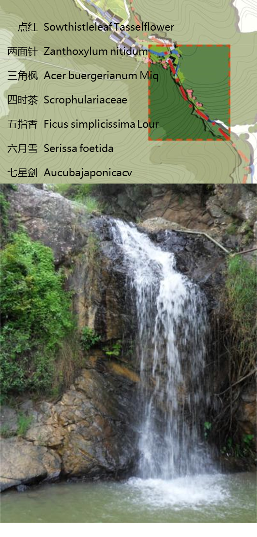 在瀑布的各階上種植七種南藥,打造中藥主題的瀑布景觀,在大眾游客進(jìn)入養(yǎng)生谷便感受到濃郁的中醫(yī)藥文化氛圍,同時(shí)也增強(qiáng)瀑布的觀賞性和知識(shí)性。