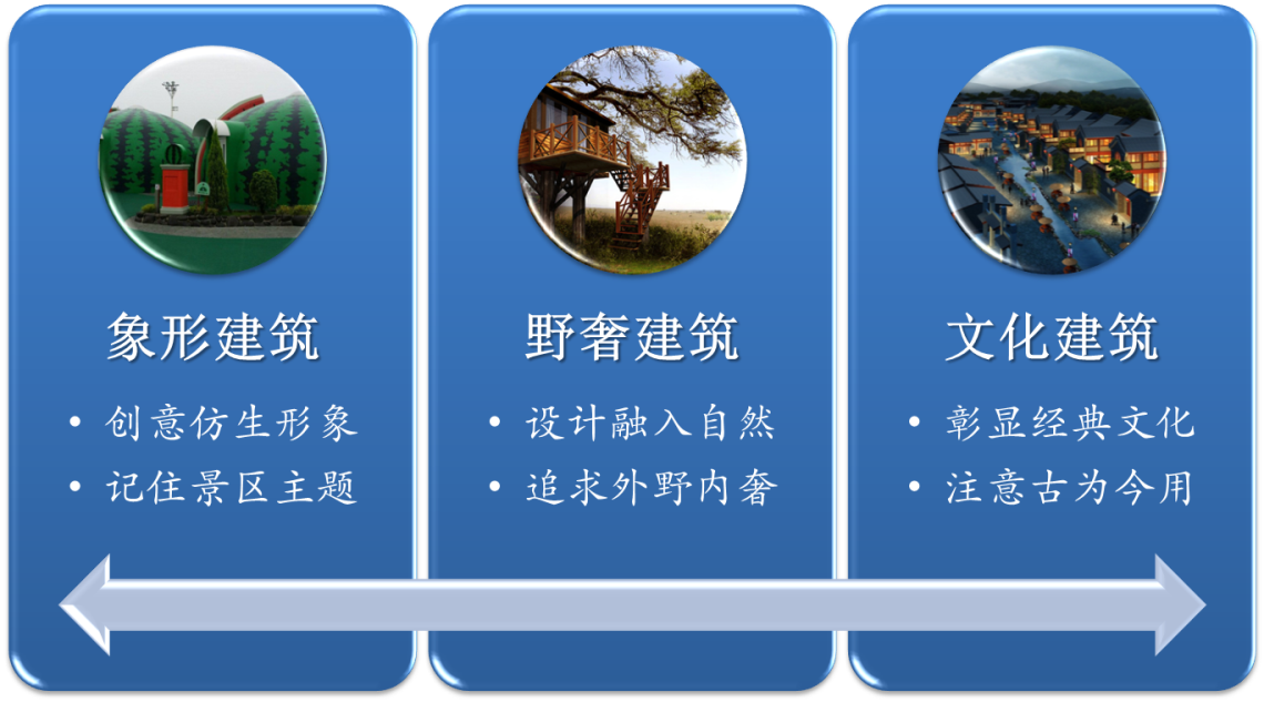 象形建筑設計:創(chuàng)意仿生形象,記住景區(qū)主題;野奢建筑設計:設計融入自然,追求外野內(nèi)奢;文化建筑設計:萃取經(jīng)典文化,注意古為今用。