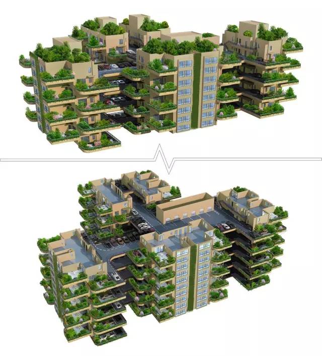 每層都有公共院落,每戶都有私人小院及一塊幾十平米的土地,可種花種菜、遛狗養(yǎng)鳥,可將車開到每層樓上的住戶門口,建筑外墻長滿植物,人與自然和諧共生。