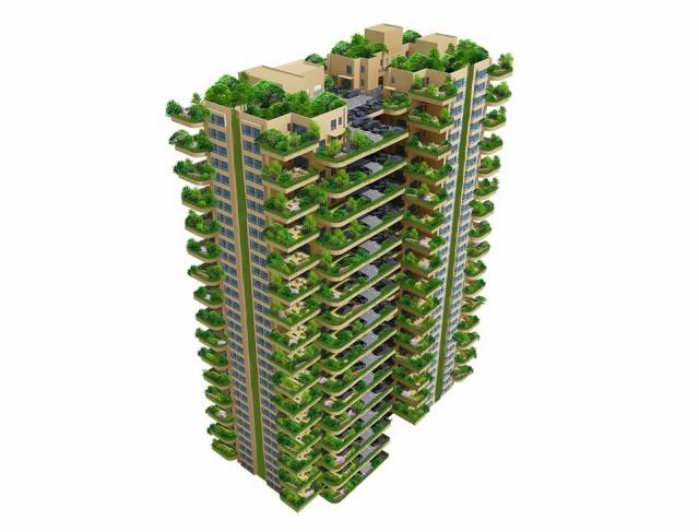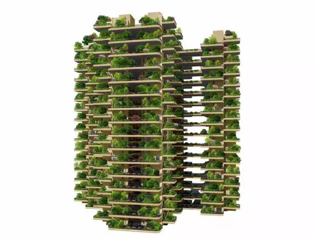 建筑外墻不但全部長滿植物,而且每家都有一座兩層樓高的空中室外私人小院及一塊幾十平米土地,覆土0.5一1米,可種樹、種花、種菜、遛狗、養(yǎng)鳥……使住在繁華城市中心的人們,不用到鄉(xiāng)下買地,都能實現(xiàn)“家園”和“回歸大自然”的夢想。