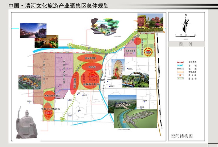 一、文旅業(yè)——城市雄心的下一塊拼圖城市是棋盤,旅游業(yè)就是其中一個(gè)棋子。這枚棋子在清河城市運(yùn)營(yíng)大棋局中,究竟充當(dāng)什么功能、扮演什么角色呢? 1、 “冀東南區(qū)域中心城市”的城市雄心改革開放的東風(fēng),以及清河人 “敢創(chuàng)偉業(yè),事爭(zhēng)一流”的清河精神,讓清河縣創(chuàng)造了一個(gè)個(gè)產(chǎn)業(yè)奇跡!清河在自身不出產(chǎn)半兩羊絨的基礎(chǔ)上,硬是打造出了“中國(guó)羊絨之都”,此外還奮發(fā)自強(qiáng)打造出了汽配產(chǎn)業(yè)、合金產(chǎn)業(yè)等支柱產(chǎn)業(yè)。被河北省命名為“發(fā)展民營(yíng)經(jīng)濟(jì)先進(jìn)縣”。 河北省“十一五”規(guī)劃期間,清河被列入全省首批擴(kuò)權(quán)縣和重點(diǎn)培育的中等城市之一; 清河縣“十二五”規(guī)劃綱要也提出:到“十二五”末,把清河基本建成冀東南區(qū)域中心城市。 ……一座冀東南區(qū)域中心城市的雛形正在形成。 2、城市雄心的“三缺一”然而,一座真正意義上的區(qū)域中心城市僅僅有產(chǎn)業(yè)活力還是不夠的!根據(jù)國(guó)內(nèi)外城市運(yùn)營(yíng)普遍經(jīng)驗(yàn),作為區(qū)域中心城市,應(yīng)該具備“城市三力”:空間形態(tài)引力,產(chǎn)業(yè)經(jīng)濟(jì)活力,精神文化魅力。 分析: (1)產(chǎn)業(yè)經(jīng)濟(jì)活力: 是清河打造區(qū)域中心城市既有優(yōu)勢(shì); (2)空間形態(tài)引力: 部分城市地段形態(tài)令人耳目一新,例如羊絨市場(chǎng)板塊集工貿(mào)游一體、現(xiàn)代化氣息盎然,頗具大中城市味道。 但整體上,中等城市骨架以及空間形態(tài)打造還在雛形中 (3)精神文化魅力: 精神文化魅力遠(yuǎn)遠(yuǎn)不足! 清河是天下張氏祖源地,通過張氏聯(lián)誼總會(huì)以及張氏祖庭營(yíng)造,已初步打造出張氏祖源文化——但還有大量潛力可挖掘而沒得到挖掘。 清河也是“武松、武大郎、潘金蓮”傳說重要所在地,《水滸傳》中明確記載的三人出生地在清河——“武松故里”這一張文化名片的塑造,尚未成形。遠(yuǎn)遠(yuǎn)落后與陽(yáng)谷、臨清等地對(duì)這一傳說的利用。 3、旅游業(yè)成就下一塊拼圖所謂“文化是旅游的靈魂,旅游是文化的載體”—— 無(wú)論是“張氏祖源文化”的深入挖掘,還是“武松故里文化”的競(jìng)爭(zhēng)性開發(fā),都離不開旅游業(yè)載體。 通過旅游業(yè)發(fā)展,不僅僅是為清河增添了一個(gè)產(chǎn)業(yè)。更重要的是強(qiáng)化了清河 “精神文化魅力”促進(jìn)清河城市形象營(yíng)銷;并且反促進(jìn)清河“產(chǎn)業(yè)經(jīng)濟(jì)活力、空間形態(tài)引力”: 清河縣縣城西北部具備形成“文化旅游產(chǎn)業(yè)聚集區(qū)”的可能性。因?yàn)檫@一片區(qū)不僅是資源相對(duì)富集,而且依托縣城,有良好的交通、市場(chǎng)區(qū)位、人力、基礎(chǔ)設(shè)施等要素聚集。 因此,清河旅游突破,必須拋棄“撒胡椒面”思想。以西北部“文化旅游產(chǎn)業(yè)聚集區(qū)”為引擎。 二、文化產(chǎn)業(yè)集聚區(qū)策劃1、空間范圍:坐落在以縣城為中心的西北部,指從西部的張氏祖庭、崇興寺、快活林、貝洲古城一直到北部清涼江生態(tài)園這一范圍。 該聚集區(qū)劃分為 “兩帶六區(qū)”。“兩帶”指清涼江生態(tài)景觀帶、大運(yùn)河綜合景觀帶;“六區(qū)”指羊絨文化體驗(yàn)區(qū)、城市游憩區(qū)、貝州古城體驗(yàn)區(qū)、戶外運(yùn)動(dòng)休閑區(qū)、張氏文化休閑區(qū)、鄉(xiāng)村生態(tài)體驗(yàn)區(qū)。 這一范圍內(nèi)有樹林、湖泊等自然資源,也有張氏祖庭、寺廟等文化資源;并且在區(qū)位上相對(duì)集中有利于產(chǎn)生聚集規(guī)模效益;且環(huán)繞縣城有較好基礎(chǔ)設(shè)施依托。因?yàn)榻ㄗh規(guī)劃成“文化旅游產(chǎn)業(yè)集聚區(qū)”,成為清河旅游開發(fā)的領(lǐng)航項(xiàng)目。 2、支撐項(xiàng)目:主要項(xiàng)目構(gòu)成有:清河羊絨城、貝州古城、清河湖、溫泉度假莊園、金瓶梅文化園、隋唐大運(yùn)河、張氏祖庭、張氏會(huì)館、張氏文化一條街、清涼江生態(tài)園、百果園、青少年見學(xué)基地等。