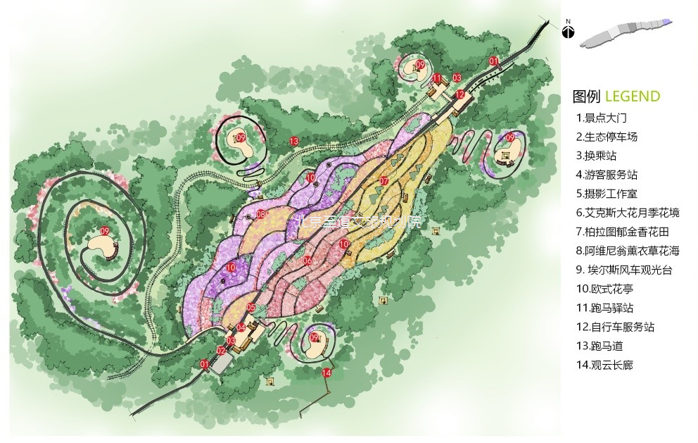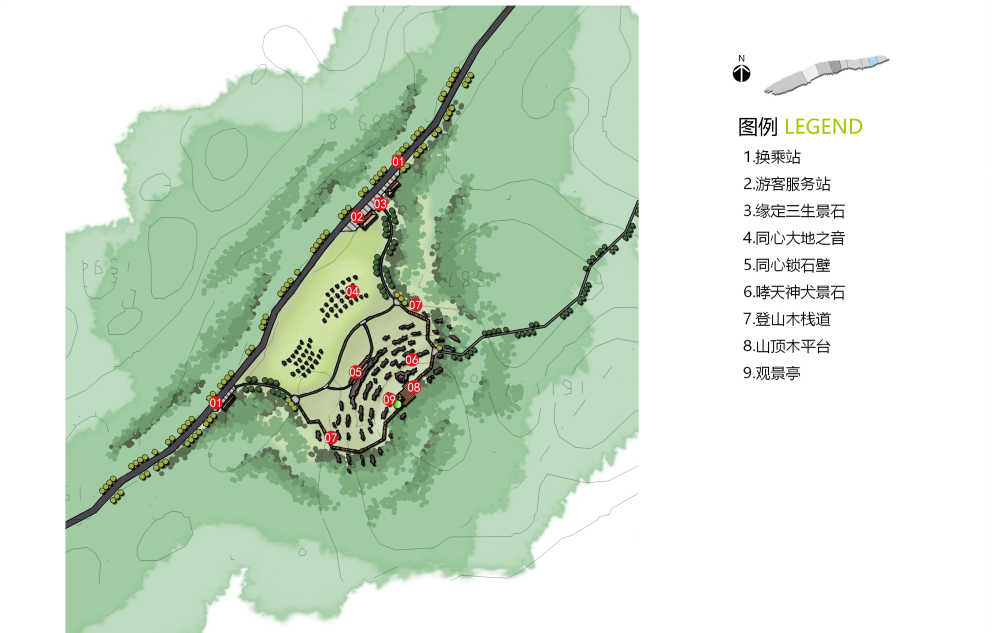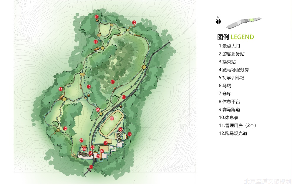 該區(qū)域以旅游觀光為主,禁止私家車進(jìn)入,使用環(huán)保電瓶車組織車行交通,輔助以馬道和自行車道。集中展現(xiàn)齊岳山的“草、云、風(fēng)、光”四大賣點(diǎn)。