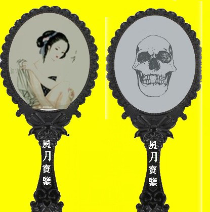 賈瑞拿了“風(fēng)月寶鑒”后,先照背面,只見一個骷髏立在里面,嚇得賈瑞連忙掩了罵:“道士混帳,如何嚇我!----我倒再照照正面是什么?”于是又將正面一照,只見鳳姐站在里面招手叫他。賈瑞心中一喜蕩悠悠的覺得進(jìn)了鏡子,與鳳姐云雨一番。一睜眼,鏡子從手里掉過來,仍是反面立著一個骷髏。反復(fù)多次,最后,剛要拿出鏡子來,只見黑白無常兩個人走來鐵鎖把他套住,一命嗚呼。
