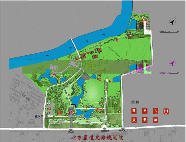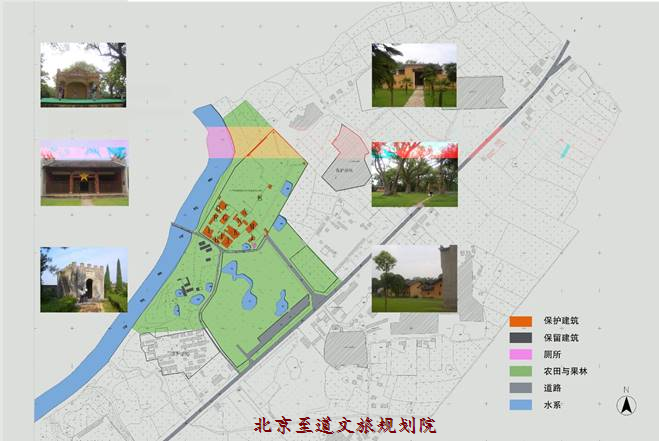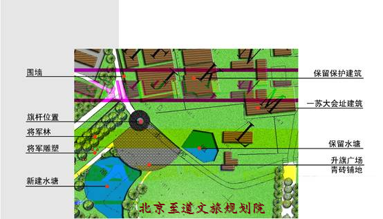 兩翼:舊址保護(hù)區(qū)綠色區(qū)域,南部大面積的田園風(fēng)光區(qū)域