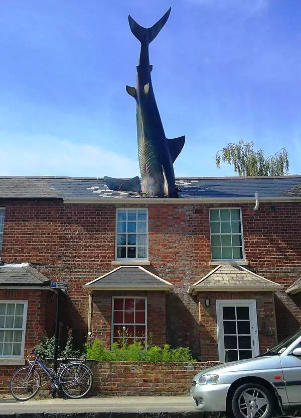 這座7.6米高的雕像也稱《無題1986》。這座雕像最初被市議會視為異類,被要求拆除,但后來還是逐漸被人們所接受。作品在1986年完成,為了紀(jì)念美國向日本長崎投放原子彈的41周年。屋主請雕塑家John Buckley設(shè)計,并請當(dāng)?shù)氐墓そ惩瓿闪艘恢挥山饘?、樹脂和石膏做成的鯊魚,讓它模仿原子彈的軌跡,一頭“栽進(jìn)”房頂。