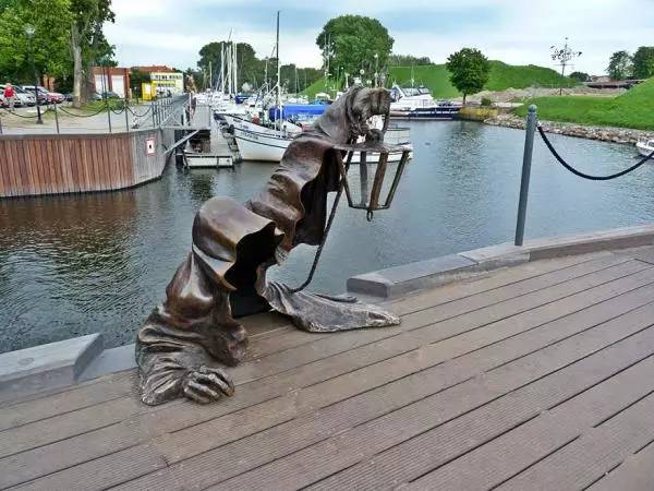 傳在公元1595年,Klaipeda大城堡守衛(wèi),Hans von Heidi,看到了一個不同尋常的幽靈漂浮在河邊。部分游客警告警衛(wèi),糧食和木材也許會在未來一段時間發(fā)生短缺的情況,就像這個黑色幽靈短暫地出現(xiàn)又消失了。于是之后的藝術(shù)家就根據(jù)這個傳說,真的在水邊建造了這樣一具“幽靈”,夜晚綠燈亮起,使來往的行人更覺恐怖。不過白天看還好,幽靈的斷腳還很別致。
