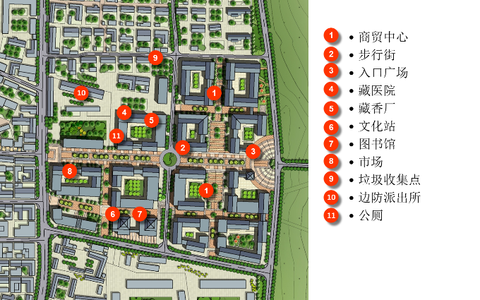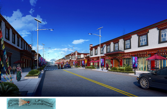 根據(jù)地形特點(diǎn)和功能需求,在鎮(zhèn)區(qū)南北兩側(cè)布置具有對外服務(wù)和展示功能的旅游綜合服務(wù)區(qū)和新型居民點(diǎn),在東側(cè)通往不丹方向布置綜合商貿(mào)中心,西側(cè)結(jié)合自然山體建設(shè)鎮(zhèn)區(qū)山地公園。由此形成鎮(zhèn)區(qū)的空間布局.