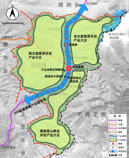 即:兩軸:城鎮(zhèn)景觀風(fēng)貌軸、城鎮(zhèn)生活軸;六大分區(qū):旅游綜合服務(wù)區(qū)、綜合商貿(mào)區(qū)、帕里老城、帕里新居、休閑區(qū)。