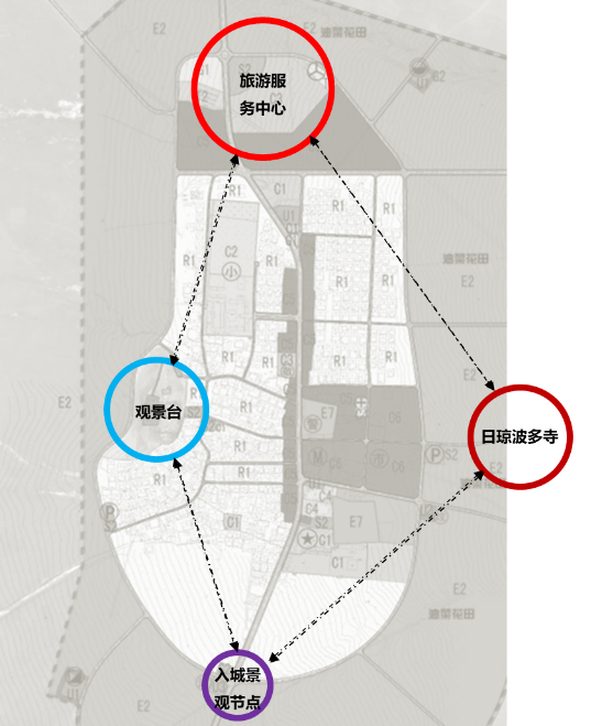 借助地形特點(diǎn)設(shè)置觀景臺(tái)及步行道,便于俯瞰全鎮(zhèn),創(chuàng)造豐富的旅游體驗(yàn)。