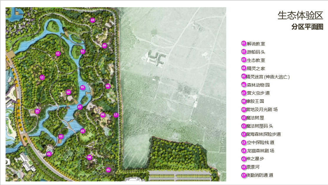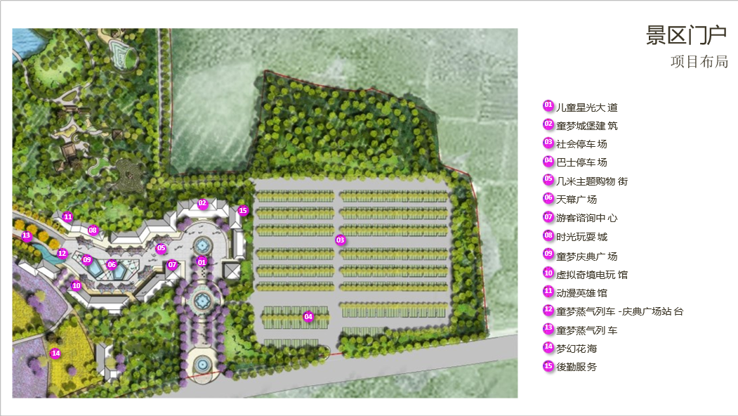 利用現(xiàn)狀橡膠林基底打造公園門景區(qū),兼具游客服 務(wù)、藝術(shù)創(chuàng)造及旅游購物的旅游門戶集散區(qū)。