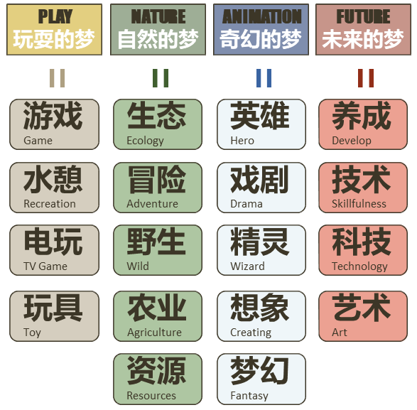 雖然童年的時代不同,夢想都是接近的……我們確立:玩耍的夢、自然的夢、奇幻的夢、未來的夢四大主題產(chǎn)品。