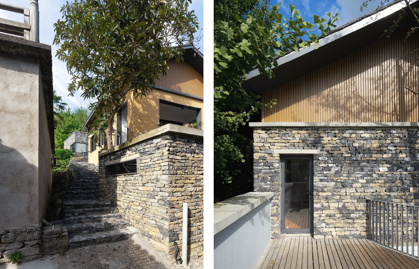 壘石和夯土是該地區(qū)代表性本土建造技術。本項目在保留原有建筑部分石墻的基礎上,就地取材,充分利用當?shù)氐膲臼秃煌良夹g來重塑建筑,其中泥瓦坊和茶藝坊采用仿夯土的外墻做法而陶藝吧則采用的是杭徽石壘石的外墻做法。